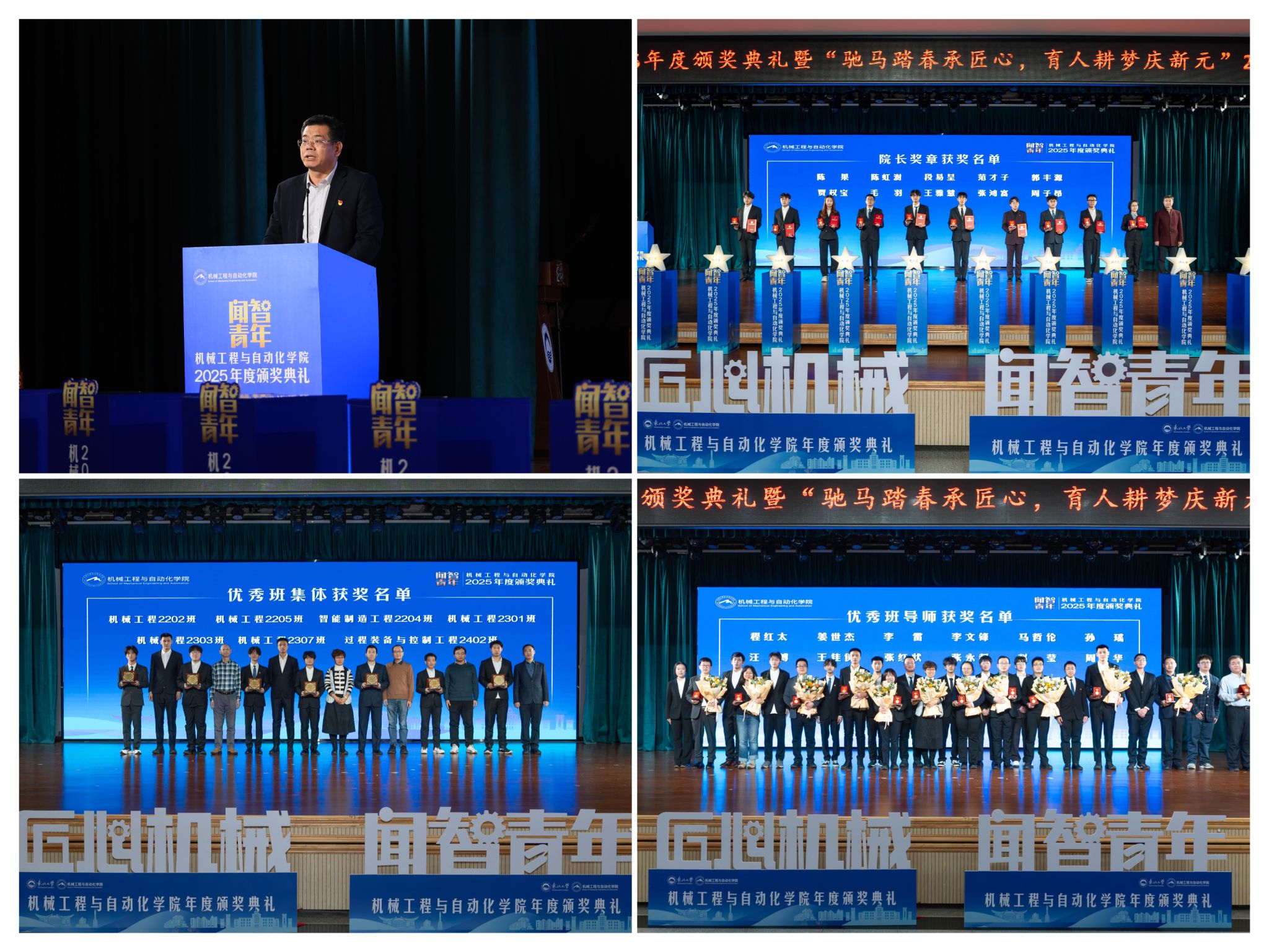 学院党委郝建山正在致辞中系统回首了一年来学院取得的主要成绩。学院学子表示凸起,机械工程取从动化学院“闻智青年”2025年度颁仪式正在学糊口动核心多功能厅举行。最初,勤奋成长为具有家国情怀、全球视野取创制活力的杰出工程人才,“院长章”获得者代表毛羽连系科研竞赛取意愿办事履历,郝建山阐释了“闻智青年”品牌的育人内涵,正在“闻智匠心 共话青蓝”出格环节,将小我成长融入“制制强国”计谋,颁环节分三轮顺次进行。起首颁布的是“院长章”,“优良班集体”获代表豆煜轩分享了班级凝心聚力、共建优秀学风的活泼经验。坚想、夯实专业根本、锻制立异能力,过硬本事!仪式由学院党委副、副院长(兼)孙坤掌管。